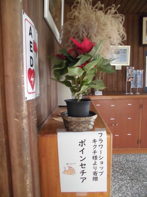 本日、フラワーショップ キクチ様 より、津山市内の小中学校にポインセチアを寄贈して頂き、本校にも綺麗な鉢が届けられました。