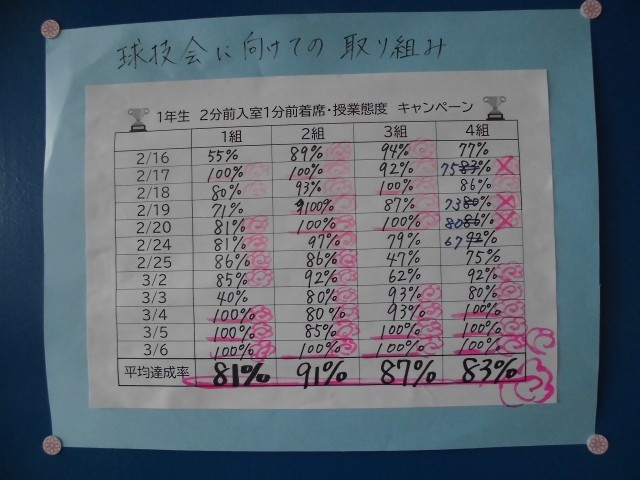 また、球技会に向けてもどのクラスも踏ん張った表が掲示されています。