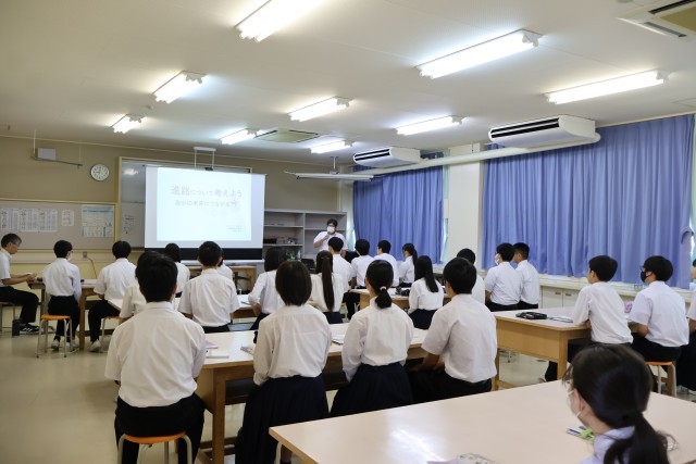 本日の午前中、3年の生徒及び保護者を対象に「進路説明会」を行いました。近隣の8校の高校と津山公共職業安定所の方にお越しいただき、進路選択や各校の特色等について、直接お話を聞くことができ、自分自身の今後の進路について考える貴重な機会となりました。