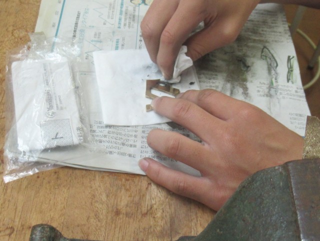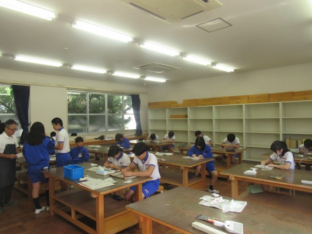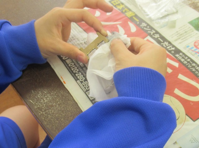 写真1~3枚目は、2時間目2年技術の金属加工(キーホルダー作成)の様子です。5月ごろから、1枚の金属板にイニシャルなどをデザインし、それを切断したり、磨いたりしてきました。本日は仕上げ剤を使って、ピカピカの光沢がでるように拭き取ったりしていました。自分でデザインし、加工したキーホルダーに愛着を感じていることと思います。