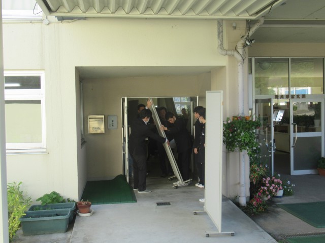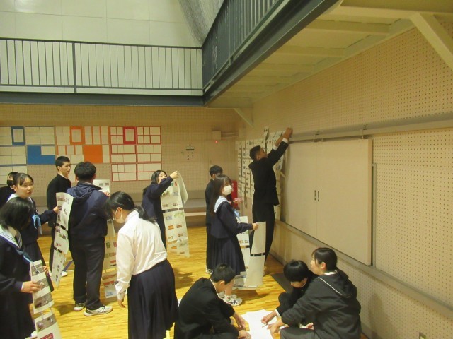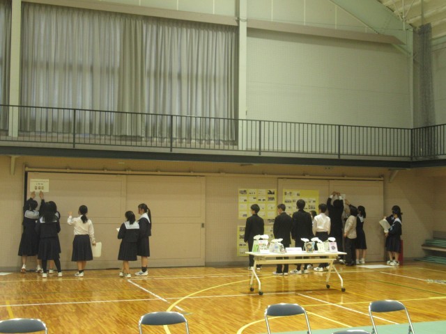 シートを敷いて椅子を並べたり、発表に使うスクリーンやテレビ、ボードを運びセッティングしたり、各教科や行事で作成した作品を展示したり、会場や周辺をきれいに掃除したりと、それぞれが積極的に動き、スムーズに整えることができました。その後、設営した会場で、明日に向けての発表練習も行いました。