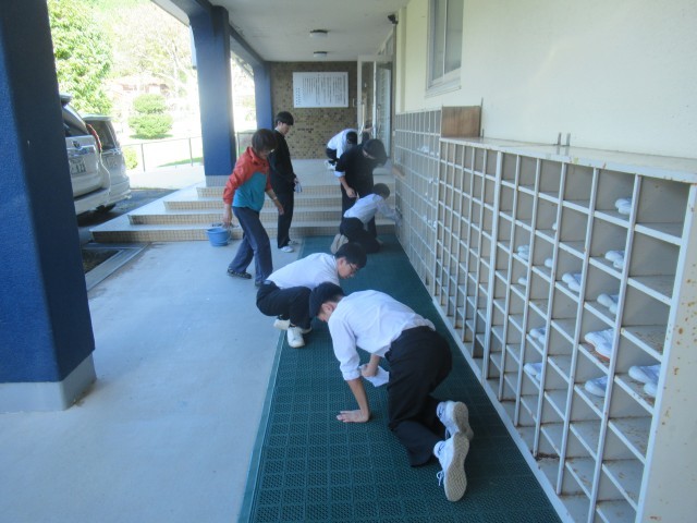 明日の文化発表会に向けて、会場準備や周辺清掃を、縦割りグループで頑張りました。
