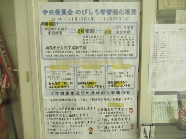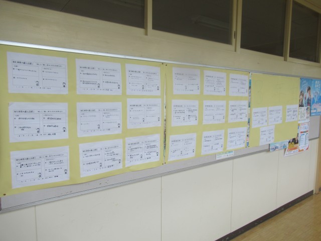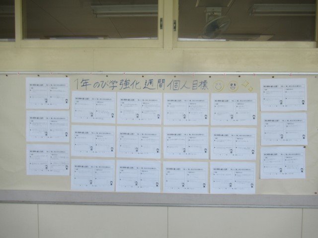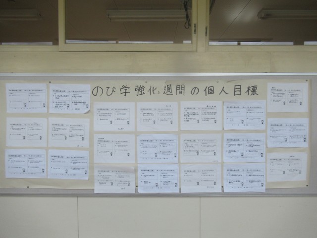 先日の「のび学集会」(生徒集会)後、教室で個人目標を立てたものを、中央委員会が教室前廊下に掲示しました。(写真2~4枚目)