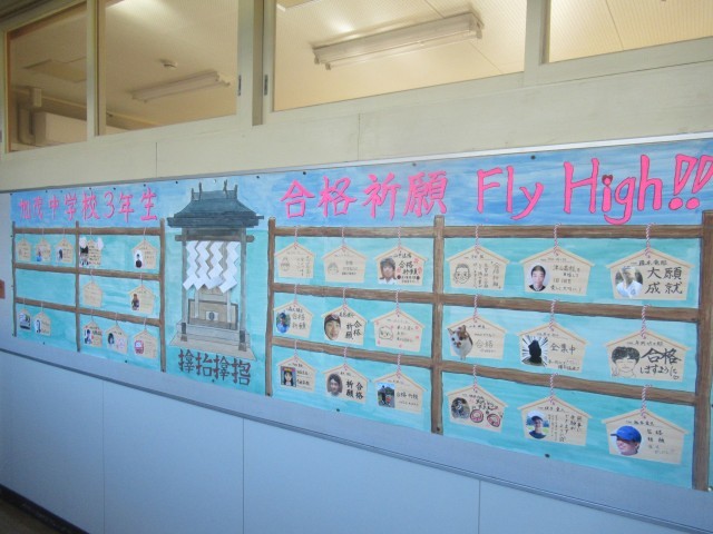 20日(木)の朝、3年教室前廊下の掲示板に「合格祈願神社」が現れ、登校してきた3年生を驚かせていました。(写真1,2枚目)