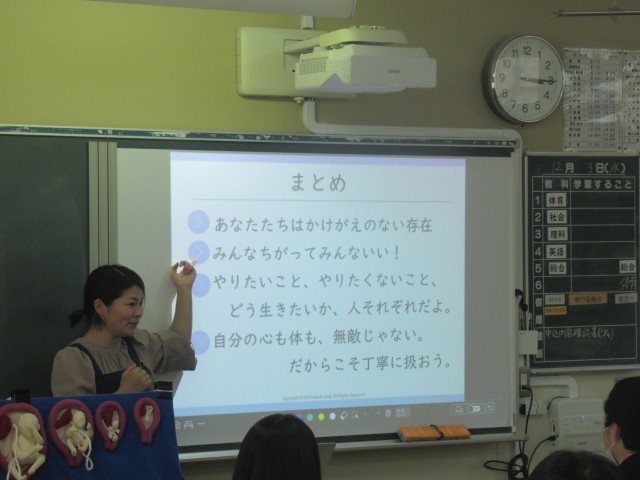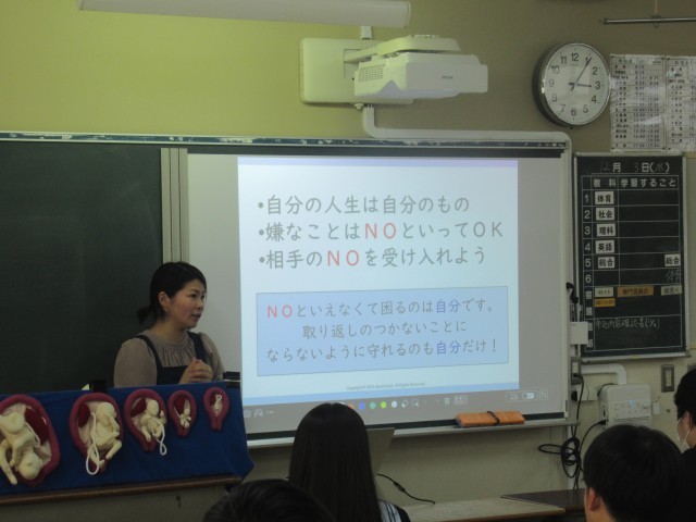 講師の方から、「大切なあなたの心・体・未来のために」と題して、命の誕生や心身の成長、人とのつきあい方などについて、映像や模型などをも使いながら熱心にお話していただき、生徒も真剣に聞き、考えていました。大切な「心と命」について、あらためて考える貴重な機会となりました。お忙しい中、ありがとうございました。