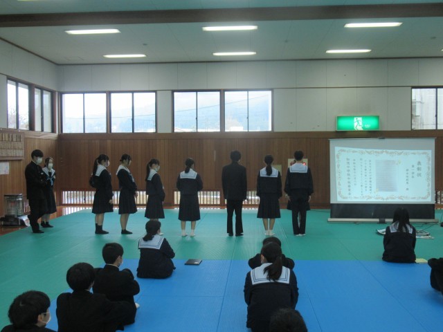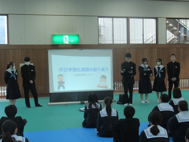 定例の生徒集会を行いました。図書員会からは「『ぽかぽかメッセージ』の協力依頼と冬休みに向けての本の貸出案内」、環境美化委員会からは「大掃除に向けての拡大運営委員会のお知らせ」、保健体育委員からは「加湿タオルの取組への協力依頼」、中央委員会からは「『のびしろ学習週間』の振り返りと表彰」などがありました。