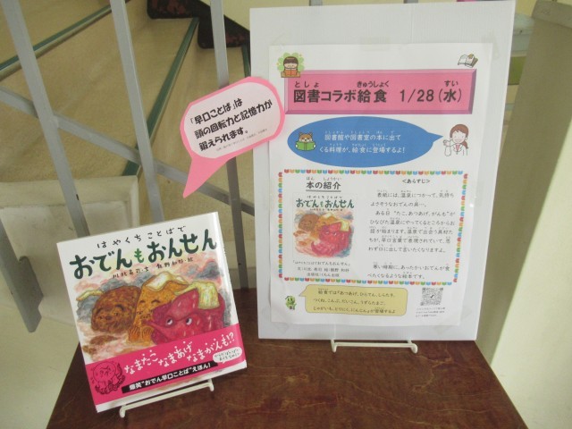 今日は「図書コラボ給食」でした。本に出てくる料理や食べ物を食べることで、給食と読書の両方に興味、関心を持つきっかけになることを期待して企画されたものです。今日の本は『おでんもおんせん』で、おでんたちのやってくる、ひなびた温泉でつぎつぎくり出される「おでんの早口ことば」が楽しい絵本です。