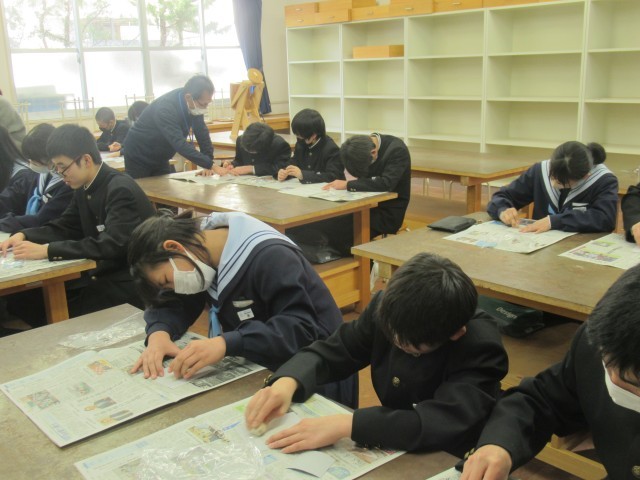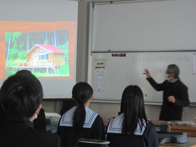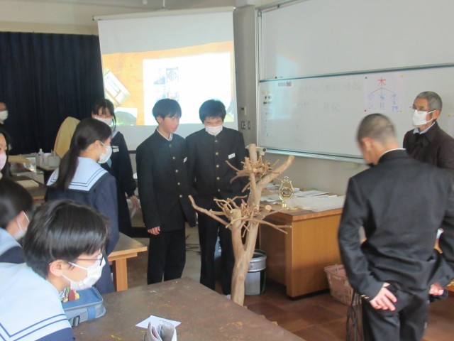 つやま郷土学として、地元の宇治先生をお招きして、1年生に「木のアートで加茂から世界へ」というテーマで授業をしていただきました。アートを通して活発に行われている国際交流の様子、地域資源を生かした数々のアート作品や創作拠点のご自宅の様子も紹介していただきました。そののち、「希望の卵」(写真4枚目)の作品づくりに挑戦しました。宇治先生がある程度準備してくださった多角形の杉の木をサンドペーパーで磨き、少しずつ丸みをもたせて卵形に近づけていきました。木の香りを感じながら、楽しそうに磨いていました。残念ながら時間内に完成とはいきませんでしたので、残りは家で挑戦することと思います。宇治先生、大変ありがとうございました。