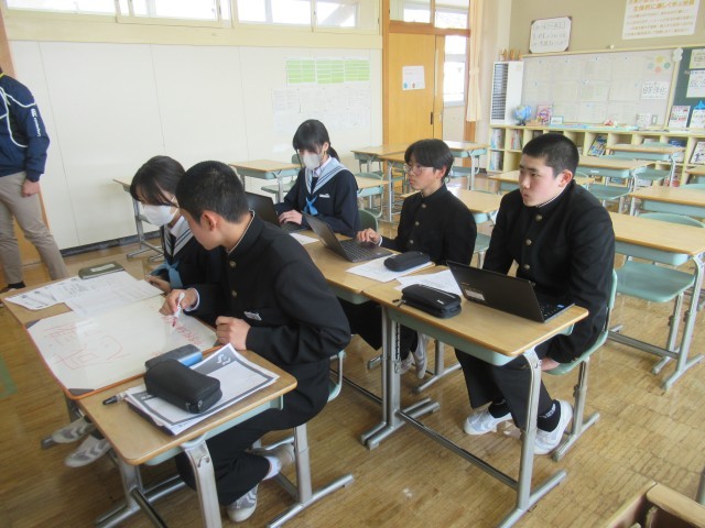 「おかやま学びたい賞」とは、岡山県内の小中学生が住んでいる地域の魅力、課題の解決、地域活性化の提案など、自ら課題を発見し、グループで協力しながら課題解決に取り組んだ学習の成果を発信、交流するものです。本校で取り組んでいる「SDGs学習」の目的や内容であり、他校の取組も参考となることから、いくつかのグループを応募し、本日のフォーラムには2年の1グループ(5人)が参加しました。(今年度の応募作品は、小学校46点、中学校45点、総数91点でした。)