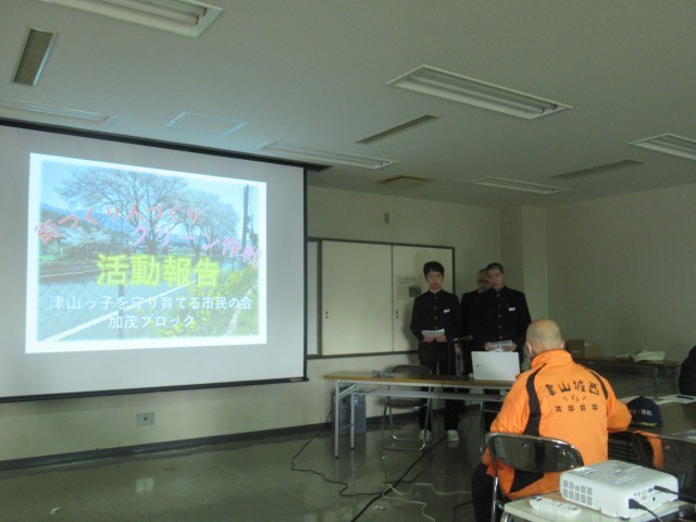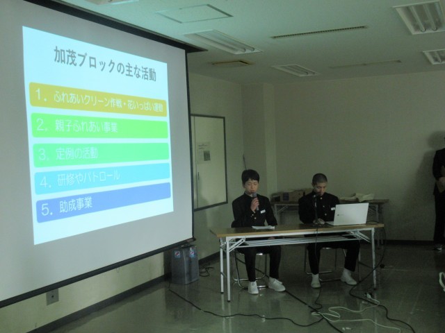多くのブロックは守り育てる会の会員(大人)から発表でしたが、加茂ブロックは加茂中生徒会の2名が参加して発表しました。子ども(津山っ子)の視点や感想を交えながら堂々と発表し、会場の皆さんからも「とても素晴らしかった」と好評をいただきました。