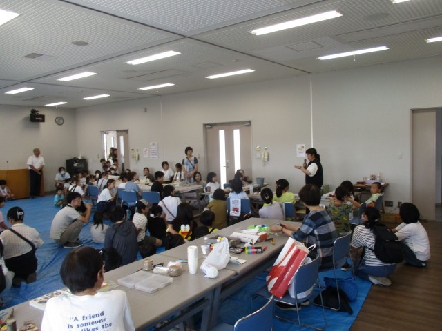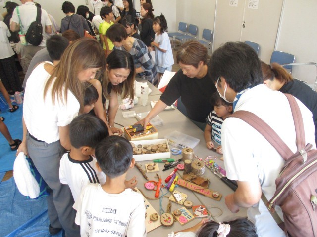 まず松本会長さんや5つのブースの代表者から作業の説明を聞いた後、約100人の親子が興味のある工作ブースへ集まり作業が始まりました。最初はコツが掴めない子供たちも一緒に材料を組み立てたり中学生ボランティアが手伝ったりしながら完成に近づいていました。終了時間までに5つのブースを回り全部の作品を作り上げた子供達もいました。