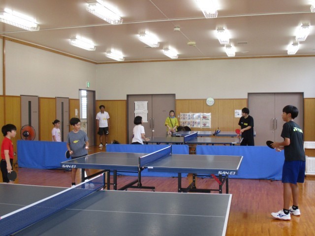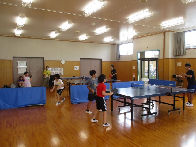 ソフトテニス部、卓球部の生徒が得意なスポーツを小学生に教えながら一緒に楽しもうという内容でした。和やかに受付を行い、自己紹介をした後はバドミントン、卓球、テニスの3種類を自由に体験してもらっていました。