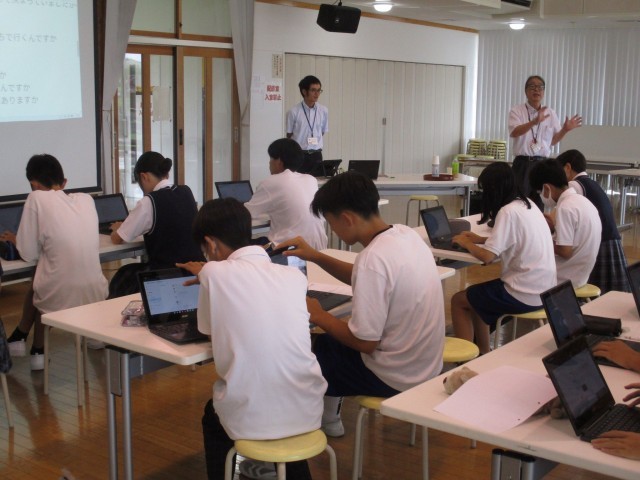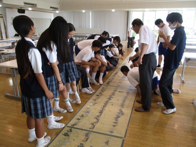 生徒は実際に参勤交代の図に近づいて気づいた、特徴や携行していた道具などについて次々と尋ねていたのが印象的でした。長い間津山と江戸で準備をしていた行列の様子には、たくさんの驚きがあったようです。最後の質問時間では、クロームブックのチャット機能を活用し知りたいことを次々に記入し、乾さんにてきぱきと回答を返していただきました。「つやま郷土学」が目指す地元津山への魅力を感じ・理解が深まった時間でした。