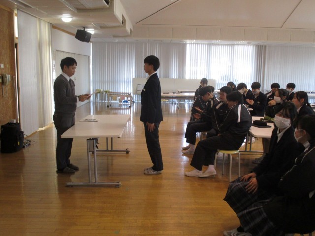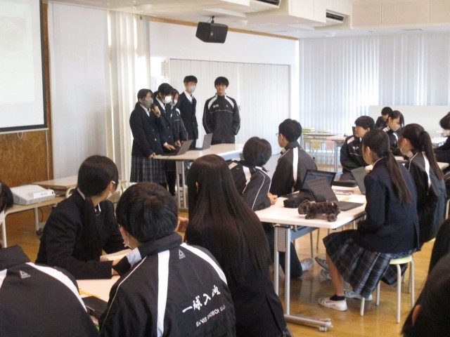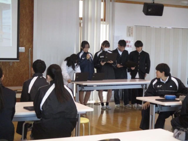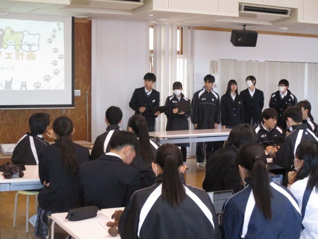 単元学習の最後に6チームによる「コンペ」の審査とそれに対するご講評いただきました。さらにマルイさんの企業CSR・社会貢献についての講話をききました。身近で利用している企業さんから直接、地域と企業の繫がりや経営で大切にしていることを聞き気付きの多い時間となりました。今回生徒からの多くの質問にも丁寧に回答してもらい(株)マルイ様には大変感謝いたしております。学校だけでは育めない資質・能力を地域のご協力で実現できますことを有り難く思います。今後ともよろしくお願いいたします。企画テーマ:猫カフェ店、焼き肉店、スムージー店、ラーメン店&子ども食堂、カフェ、イタリアンピザ屋