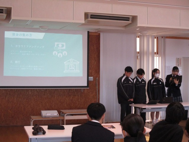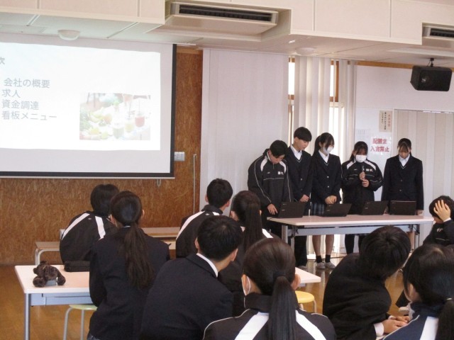 3年生が「飲食店の企画スライドを作り、コンペで提案! 開業資金を獲得しよう!」を課題とする学習発表を行いました。アントレプレナーシップ(起業家精神。広義には、急激な社会環境の変化を受容し、新たな価値を生み出していく精神。)を養うことなどを目的として、岡山県の夢育パートナーズシップ事業を活用し、(株)マルイ勝北店店長さんを審査員・講師にお招きし実施しました。