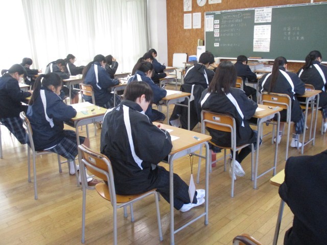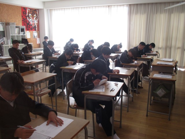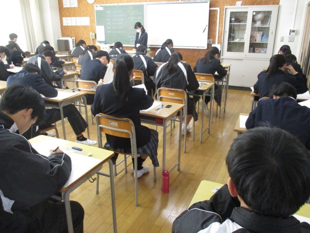 始業式の後、1,2年生が作製した受験応援カレンダーが3年生に贈呈されました。3年生は、希望の進路実現に向けここからさらなる頑張りが必要です。精神的にもしんどいこの時期を周囲の応援を力に、みんなで乗り切っていきましょう!その後、全学年5教科の課題・実力テストに真剣勝負を挑んでいました。明日から寒波が押し寄せるようですが、健康安全に注意した生活をしていきましょう。