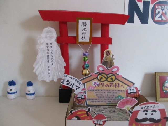 続いて各委員会から「やる気パワーアップ期間」「清掃時間優秀班員の表彰」「服装パーフェクト週間」「免疫力向上の活動」「読書紹介コーナー新設」の活動内容が発表されました。どの取組も次の学年の準備のきっかけや学年や学級の底力を高める工夫が、目新しい内容でした。明日から、全員で楽しみながら協力して盛り上げていって欲しいと思います。また3年生を応援する「勝北中神社」コーナーも登場し受験合格メッセージが集まっています。