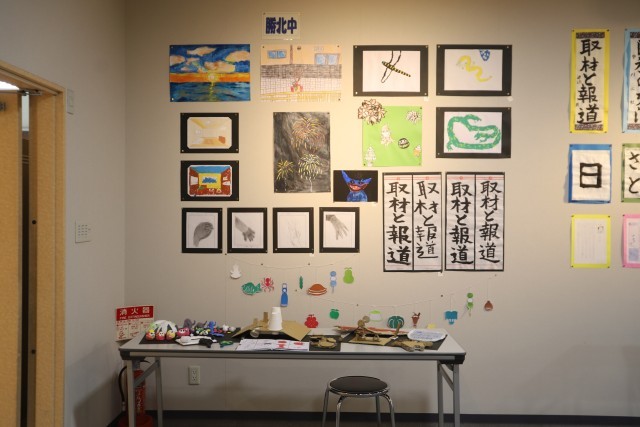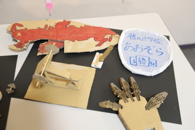 勝北中学校のコーナーでは、楽しみながら制作されたのだろうと思われる段ボール細工や、小学生の訪問で楽しんだ魚釣りゲームの魚等、制作を通して学びを深めたり楽しんだものから、支援学級での日常が伝わってきます。