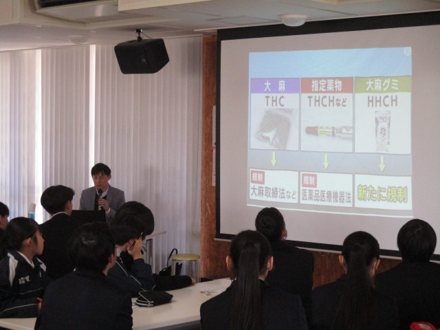 2年生が学校薬剤師の栗林先生と一緒に、危険薬物について学習しました。12月には岡山県警察の講師の方と、麻薬等の犯罪に関わらない考え方生活を学びました。