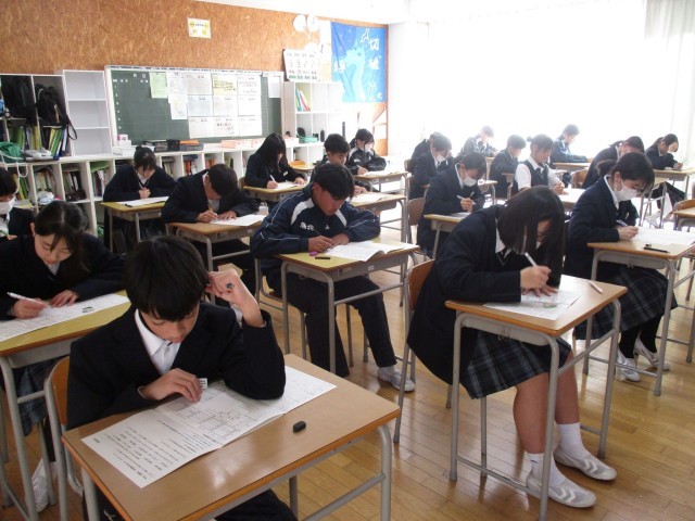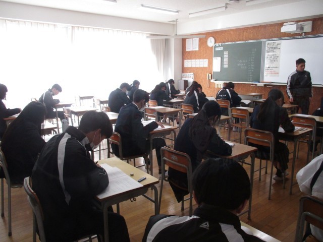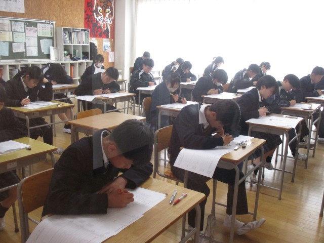 本日は1・2年生学年末テストの2日目、3年生直前実力テストが実施されました。テスト週間には、「学び直し」と質問教室で各学年教科ごとに、一人ひとり自分自身の課題に取り組んで準備をしてきました。