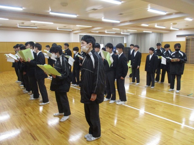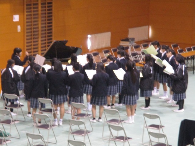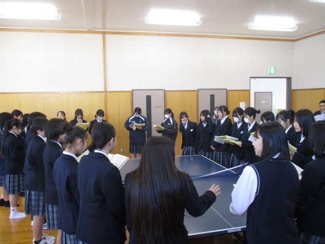 3年生が受験の大詰めを迎えている本日、1・2年生は明日のお別れ会の全校合唱練習を行いました。これまで、各学級や学年で練習してきた歌声を合わせる練習でした。練習の流れを先生から聞いた後は、3つのパートに分かれてリーダーが進めていました。文化の部の合唱で自信を付けた生徒達が、自分たちの力で1つのハーモニーを紡ぎ上げていきました。最後は体育館で全員での仕上げを行い、3年生への感謝や励ましがこもった心に響くプレゼントになりそうです。アーツ&クラフツ部もメッセージを階段アートで飾ってくれています。