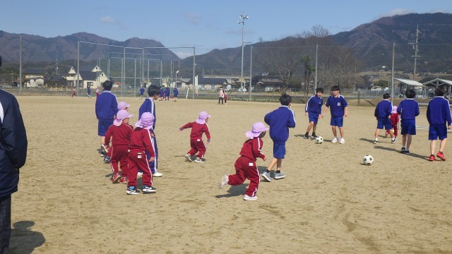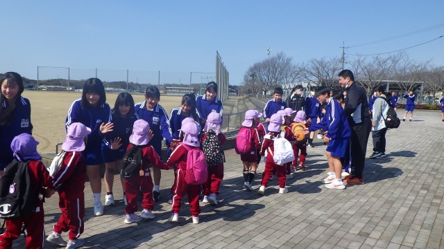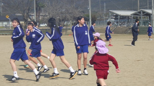勝北風の子こども園の年中31名が、本日勝北中学校グラウンドにて中学一年生と交流遊びに来てくれました。しっぽ取りゲームでグラウンドを走り回った後は、縄跳びやサッカーなど、好きな運動を一緒に楽しみました。広いグラウインドに、園児の笑い声や中学生の「可愛い!」と喜ぶ声が響き渡った30分間でした。最後は、別れを惜しむようにタッチしてお見送りしています。勝北地域で育つ子供たちの世代を超えた交流の様子に、郷土を愛するために大切な「人と人とのつながり」を深められらたひと時でした。