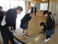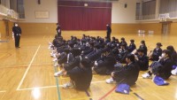 体育館では、校長先生より無事3年生が卒業したこと、在校生から心温まるお別れの会と会場準備によって素晴らしい卒業式であったお礼と、退任のメッセージとして素直で誰もが挑戦していくことを恐れない、思いやり一杯の勝北中学校を皆さんで作っていってほしいと話がありました。