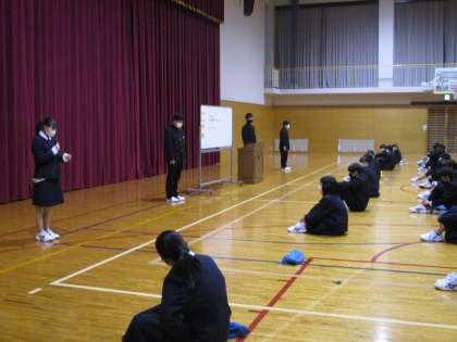 1月7日 3学期始業式 公開日 2022/01/07 更新日 2022/01/07 お知らせ 3学期がスタートしました。寒い中での始業式でしたが、無言入場、無言整列の素晴らしい態度で式に臨めました。各学年と生徒会の代表が今年の豊富を述べた後、1.2年生から3年生へ受験応援メッセージを添えた日めくりカレンダーが贈呈されました。その後、3年生は実力テスト、1.2年生は課題テストに挑みました。卒業までの授業日数はあと42日、想いの込められたカレンダーを教室に飾り、目標に向って頑張ってください!