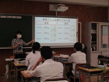 2年生の家庭科で、本校栄養教諭の春名先生を講師に迎え、”試合で力を発揮する勝負めし献立を考えよう”をテーマに、各クラス2時間続きの授業を行いました。タブレットを使い、栄養素や食べ合わせ、彩などのバランスを考え、班で意見交換しながら理想の献立を作り上げました。学んだ知識を生かし、食事でスポーツのパフォーマンスを上げられるよう自分でも取り組んでみてください。