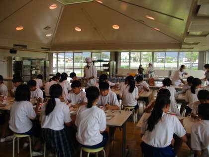 8月31日 ランチルームでの給食 公開日 2023/08/31 更新日 2023/08/31 お知らせ ここ3年間、教室での黙食スタイルをとっていた給食を2学期からランチルームへ戻しました。まずは、学級内の人数が一番多い1年生から試みています。当番による準備、片付けもスムーズで、楽しんで食べることができていました。今後の状況を見ながら全校に広げていくことを計画しています。