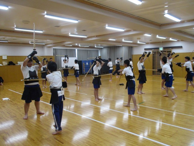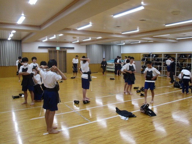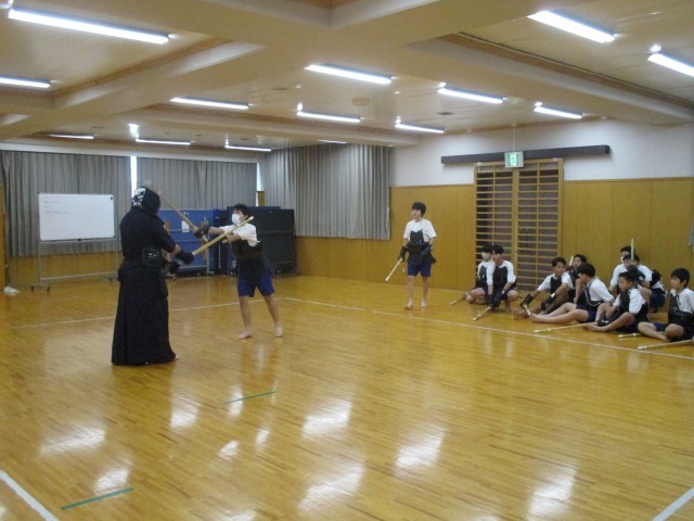2年生体育の授業で、剣道に取り組んでいます。初めて剣道に触れる生徒も多く、竹刀や剣道具の扱い方が難しく2人組で準備をしていました。先生の説明やお手本の動きをしっかり見て、竹刀を振っていきます。しかし、慣れない動きや重い剣道具のためにバランスや距離感がなかなか思うようにつかめず、ペアでアドバイスし合って工夫していました。