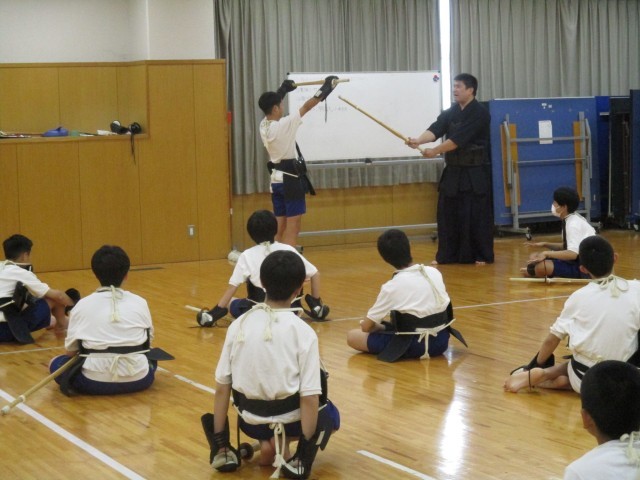 最後には先生が面を装着し、1人ひとりのメン打ちを受け、相手を打つ実感を体験しました。岡本先生、誰のメン打ちが心に響きましたか?剣道の所作から日本の文化を知り、竹刀で相手を打ち合いながら技術を磨くことを通して相手を尊重する礼の精神性を身につけていって欲しいと思います。日頃の生活でも、相手を思いやることができる心遣いを生かしていきましょう。