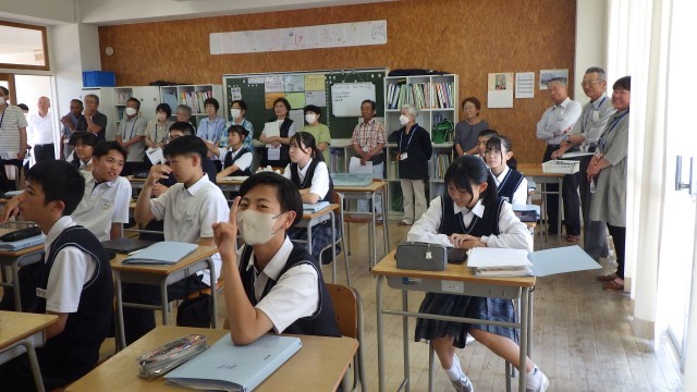 約35名の地域の皆様が、全教室の授業を参観され、生徒の一生懸命に学ぶ姿に微笑みを向けられています。