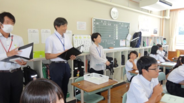 10月7日(火)の午前中に県・市教育委員会の先生方による第2回目の学校訪問がありました。来校された先生方からは、下足箱が整っている、掲示物がきちんとしている、教育環境がよくなった等のご意見をいただきました。また、生徒の学びに向かう姿勢がよくなっているとの言葉もいただきました。2時間目の授業を参観していただき、その後、授業の感想や自己肯定感を高める取組について意見交換をしました。授業については、クラスごとに持ち味があり、生徒の視点で授業準備をしっかりすることが、わかりやすく楽しい授業につながっていくこと、授業は生徒と一緒につくりあげていくものだという指摘をいただきました。また、運動会以降、自己肯定感の向上のために久米中学校では、グッドビヘイビアカード(Good Behavior Card)の取組を始めました。「Good Behavior」とは、直訳すると「良い行動」のことです。誰かの「Good Behavior」によって、助けられた、ありがたかった、うれしかった等の気持ちになったときに、自分の中にとどめておかず、文字にして相手に伝える取組です。渡す方も渡された方もとても良い気持ちになります。生徒同士、教職員から生徒等にカードを渡しています。自己有用感や自己達成感、自己肯定感がさらに高まりつつあります。この取組を通して、生徒一人一人にとって居場所がある、温かい学校づくりを目指しています。本日ご指導いただきました先生方、大変お世話になりました。ありがとうございました。