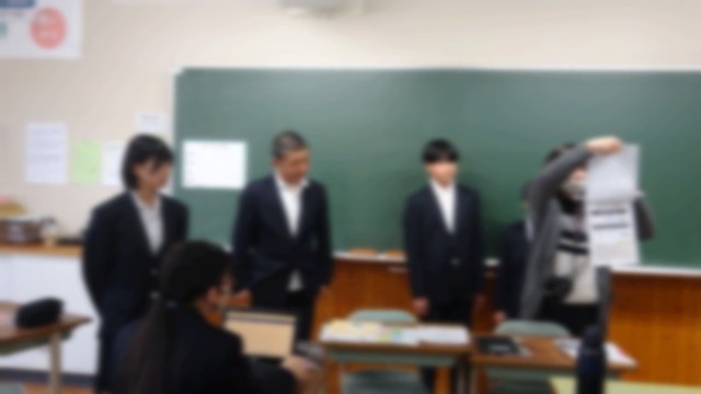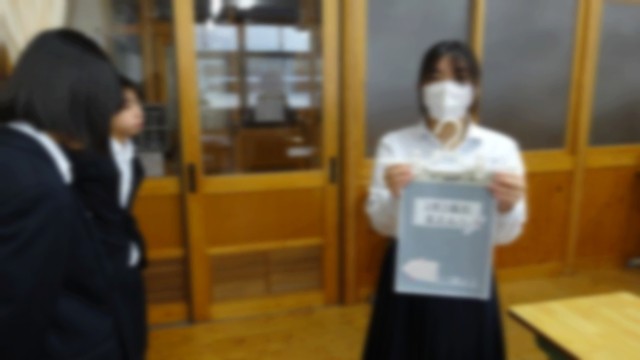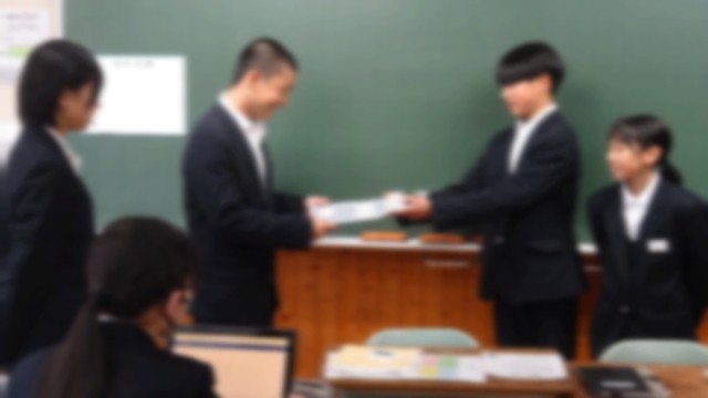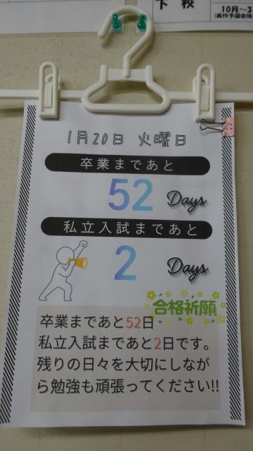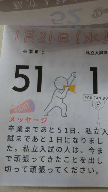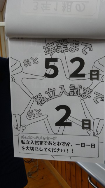 1月20日(火)の朝の会で、1年生から3年生に卒業までの日めくりカレンダーがクラスごとに送られました。これは、これから入試に向かう3年生を励ましたり、今までのお礼を伝えたりする内容のカレンダーで、1年生の生徒が一人一人日にちを決めて、製作したものです。1年生の学級代表が「入試を頑張ってください。私たち一人一人が3年生の皆さんを応援しています。」とカレンダーを手渡し、大きな拍手の中で、3年生の学級代表は、「ありがとう。自分のベストを尽くして頑張ります。」と笑顔で答えていました。さっそく教室に心のこもったカレンダーが掲示されました。後輩から先輩への温かい贈り物でした。