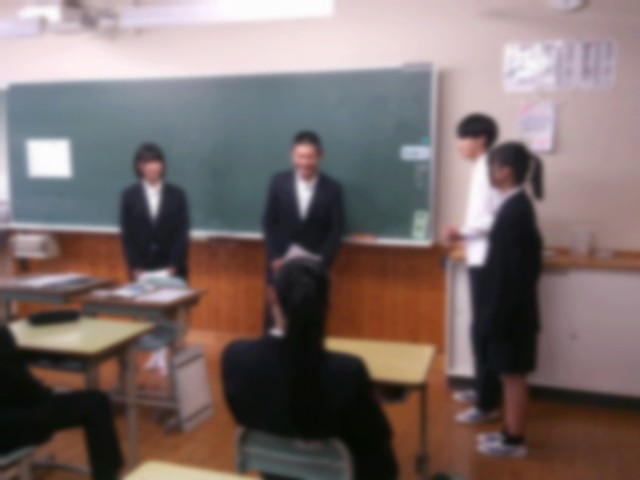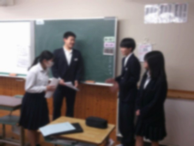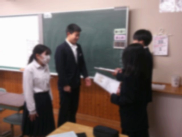 2月3日(火)の朝の会で、2年生の学級代表が、2年生一人一人が作成した、「入試に向けての問題」を3年生の学級代表に手渡しました。3年生の生徒の皆さんが、自分の進路を実現できるようにと、入試の類似問題を考えて作成しました。